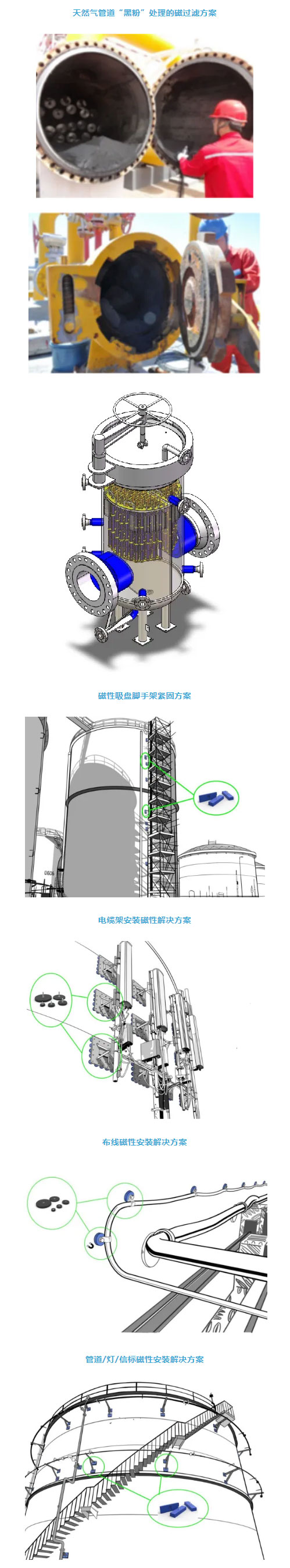 同时,我司强力推出磁吸固定产品,相比传统的焊接和螺栓固定方式,磁吸安装具有多重优势:缩短安装时间、无需熟练工人,且不损伤罐体表面,避免涉及喷漆返工。无动火风险,防止火灾和其他危险事件的发生。磁吸具有强大的可移动性和再利用性,显著节省成本。这些特点使得磁性吸盘成为石油储能领域的理想选择。